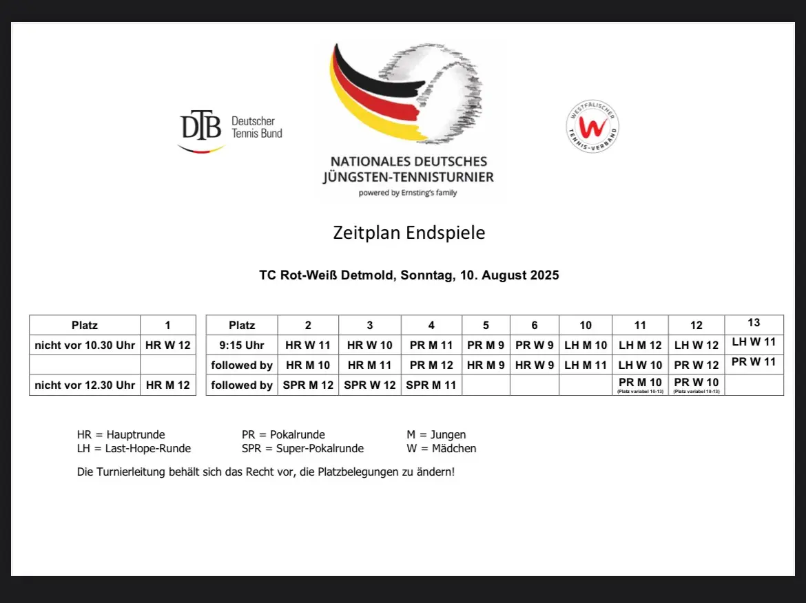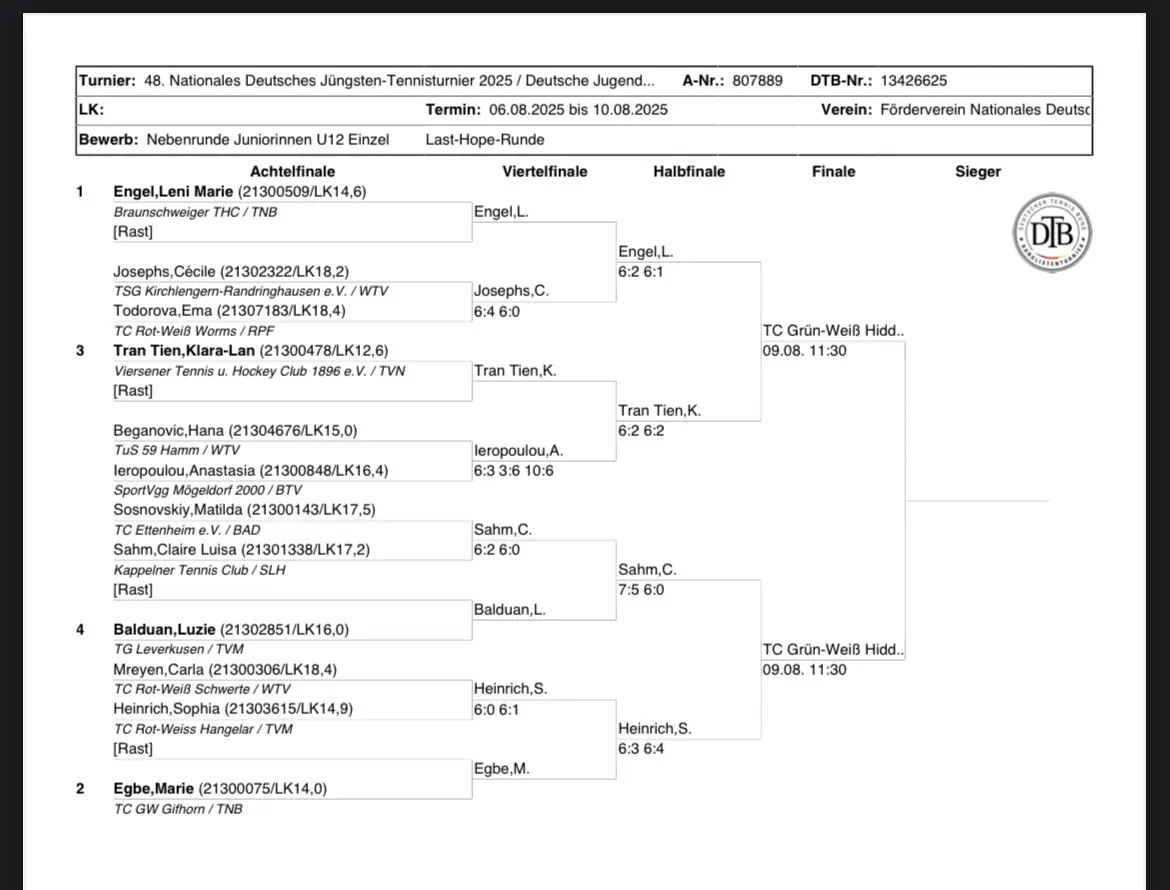 Detmold/Kappeln – Für die elfjährige Claire Sahm vom Kappelner Tennisclub ging es vom 04. - 10.08.2025 in Detmold eine der aufregendsten Wochen ihrer jungen Karriere zu Ende. Bei den Deutschen Meisterschaften der Nachwuchsspielerinnen stand sie nach fünf intensiven Turniertagen auf dem Podest – als Zweitplatzierte der sogenannten „Last Hope“-Runde.